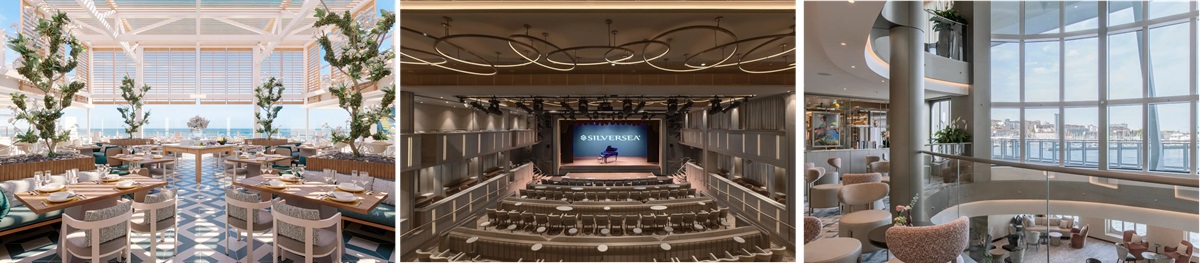 Silversea radikálne porušila tradičné pravidlá uvedením asymetrického rozloženia, ktoré maximalizuje vonkajšie a verejné priestory, ponúka bezkonkurenčný výhľad na oceán a plynulý prechod medzi interiérmi a exteriérmi. Nočná mora pre inžinierov, ale zato významné vylepšenie pre hostí. Najväčší bazén vo flotile Silversea s rozsiahlou slnečnou terasou s dostatkom lehátok pre všetkých  hostí, priestranný sky barom pod otvoreným nebom a veľkolepý salónik Venetian Lounge, kde sa divadlo a hudba striedajú so zábavnými predstaveniami a celovečernými filmami.