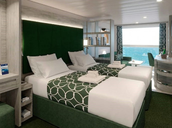 Vonkajšie kajuty Infinite s panoramatickým zasúvacím oknom, ktoré sa po otvorení zmení na sklenenú balustrádu.
