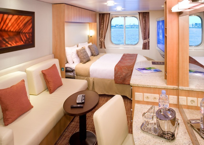 - Kajuty sú umiestnené v blízkosti lodného Spa. K ich vybaveniu patrí posilnený systém vzdušnej filtrácie, posteľ Queen-Size (v kategóriách Edge King-Size), veľké zasúvacie sklenené dvere, exkluzívne posteľné prádlo eXhale®, veľkorysé skladovacie priestory.