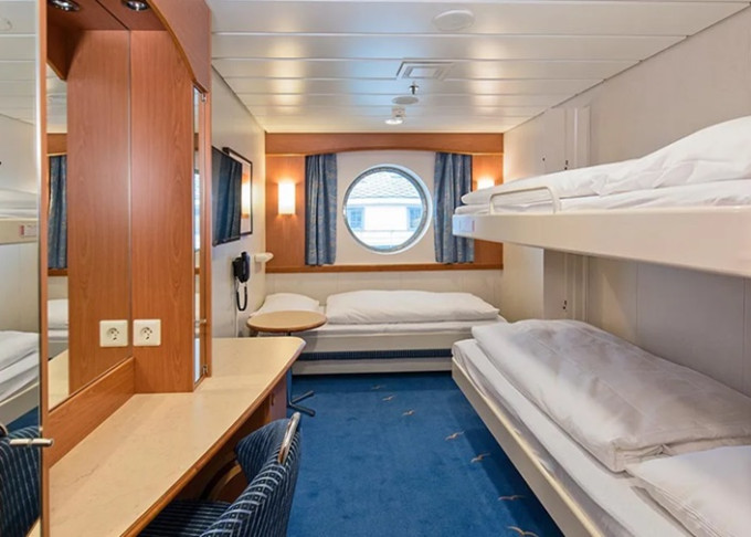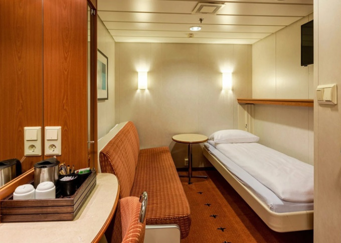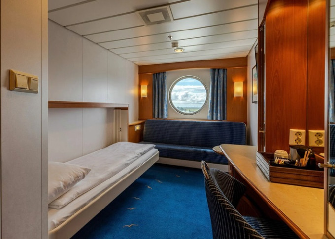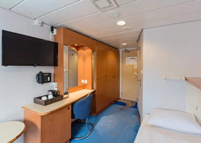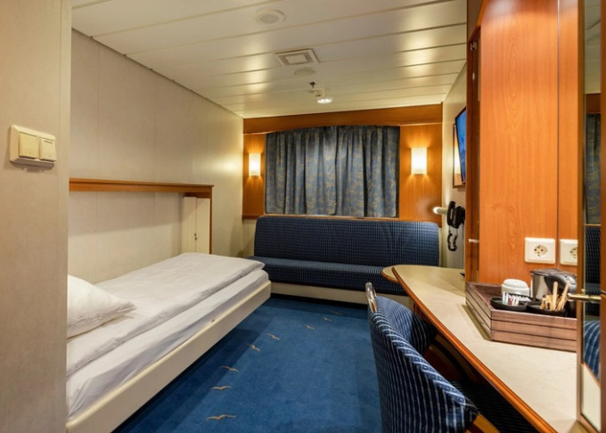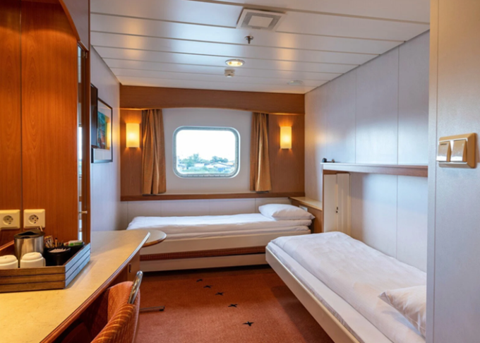Kajuty na 7. a 8. palube, s 2 lôžkami spojiteľnými do manželskej postele; varnou kanvicou a TV.