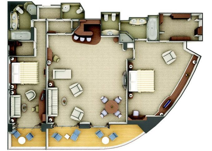 R2 - Royal Suite 2 105-110 m² + balkón 16-17 m². Royal Suite R1 spojená s Veranda Suite. 6,7. paluba vpredu. Max 5 osôb. 59 700 € 19 900 € za osobu