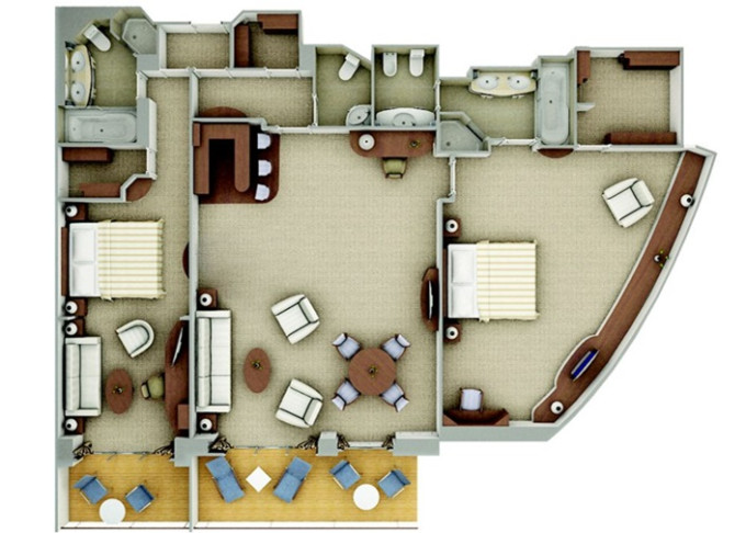 R2 - Royal Suite 2 105-110 m² + balkón 16-17 m². Royal Suite R1 spojená s Veranda Suite. 6,7. paluba vpredu. Max 5 osôb. 79 600 € 19 900 € za osobu