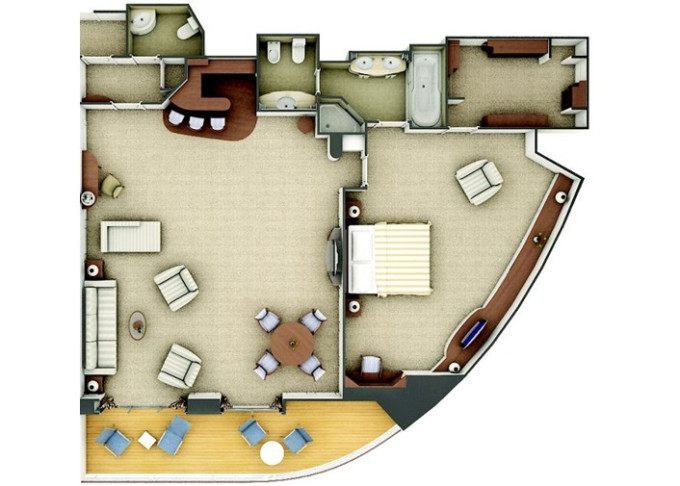 R2 - Royal Suite 2 105-110 m² + balkón 16-17 m². Royal Suite R1 spojená s Veranda Suite. 6,7. paluba vpredu. Max 5 osôb. 39 800 € 19 900 € za osobu