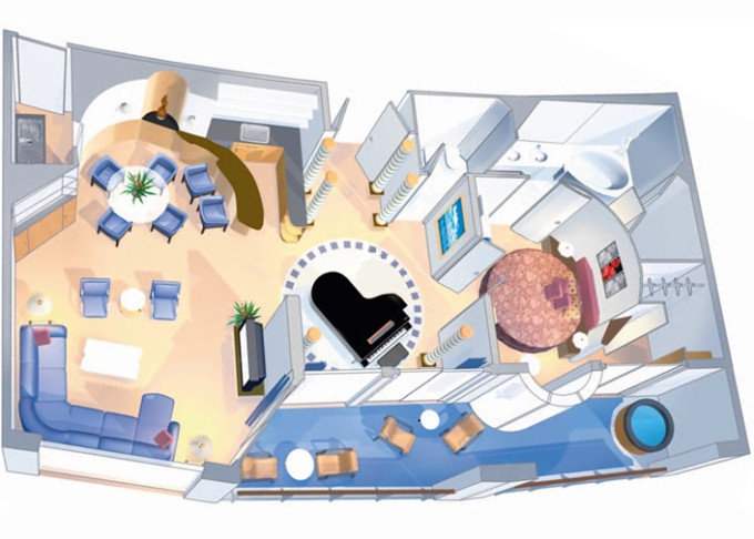 - "Peek-a-boo bridge" výhľad na kapitánsky mostík, kde máte jedinečnú príležitosť nakúkať cez plece kapitánovi a posádke pri riadení lode (celkom na prove, 11. paluba)