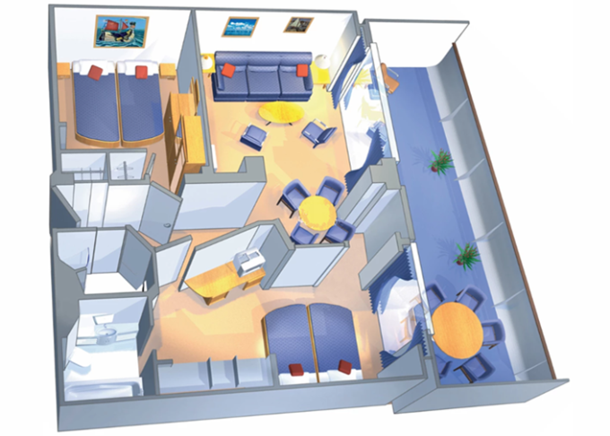 | VP - Ocean View Panoramic Suite (bez balkónu) 37 m². Panoramatické neotvárateľné okná. Oddelená časť s poschodovou posteľou. Extra WC. 12. paluba. Max 6 osôb. Výhody Suite. | 2 998 € 1 499 € za osobu | ||