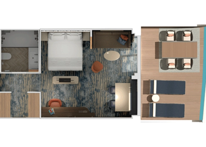 HU - Suite Havana Cabana Corner 33 m² + vonkajšie rohové patio 15 m². 8. paluba vpredu. Max 3 osoby. Tropický štýl, vstup do exkluzívnej zóny Havana. Výhody Suite. 4 248 € 2 124 € za osobu