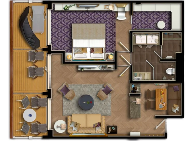 | SUTO - Themen Suite 54 m² + balkón 15 m² so stolom, ležadlom a hojdacou sieťou. Spálňa, obývacia časť, šatník. 10. paluba. Max 4 osoby. Výhody Suite. | 7 746 € 2 582 € za osobu |