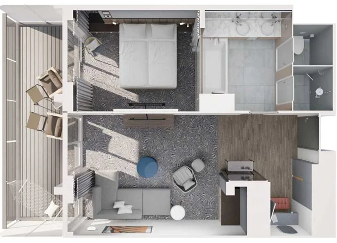 | JBCO - Junior Suite s balkónom C 26 m² + balkón 7 m² so stoličkami a podnožkami. 7. paluba. Max 4 osoby. Výhody Junior Suite. | 6 998 € 6 998 € za osobu |