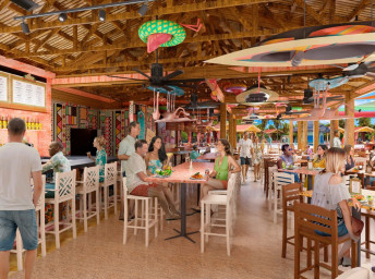 • Floating AquaBanas (12 kabín na prenájom) poskytujú osem miest na sedenie, pevný stôl, protišmykové povrchy a priamy prístup do Starfish Lagoon. Chatky sú zoskupené okolo polostrova s ​​vyhradeným nápojovým barom